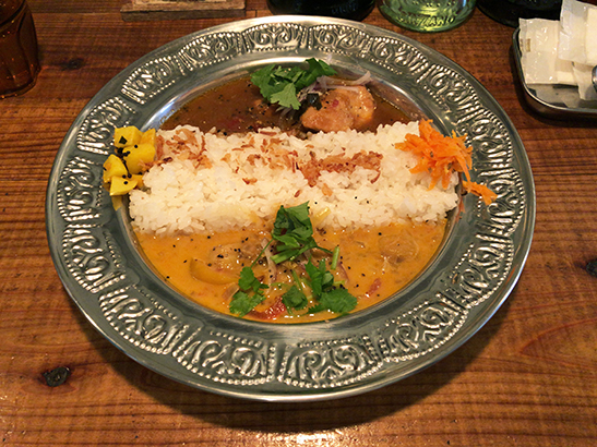 要町のビール醸造所スナークリキッドワークスで肉とパクチーのシャビシャビマサラ飯。大久保のTapirの方が作ってる(6月現在)。来週から冷や汁のシャビシャビ飯になるらしい。