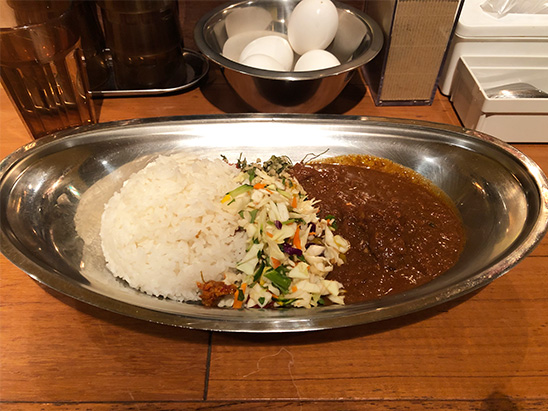 目白のミートカレーカサガワでミートカサガワカレー 野菜とご飯の量が選べるんだけど、どちらも普通で自分には十分多かった。野菜はキャベツともやし、ガーリックラー油で独特の辛さがあってガッツリの人にはいいかも